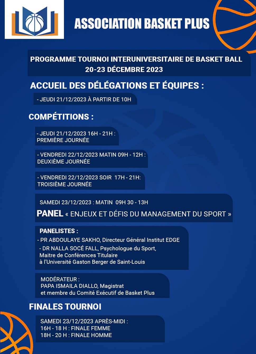 La Fondation Kéba Mbaye parraine la Compétition Universitaire Basket et Études (CUBE) de l’association Basket Plus Saint-Louis Université Gaston Berger de Saint Louis du 20 au 23 Décembre 2023.